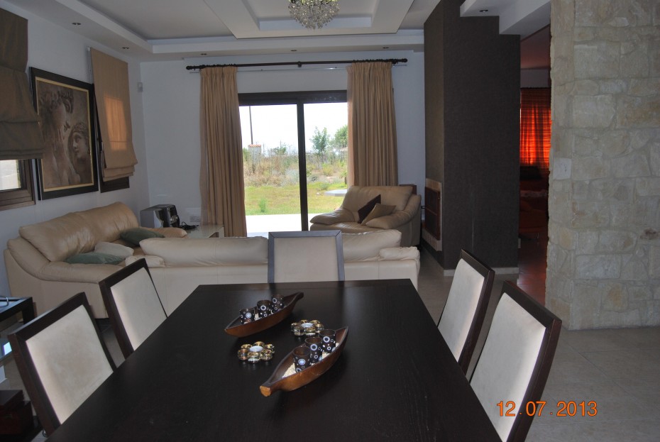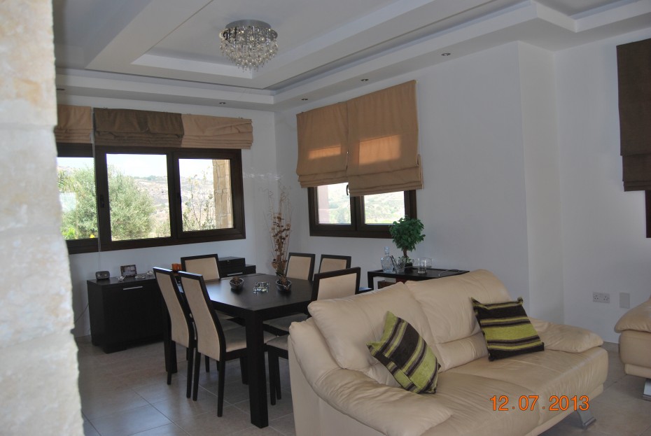 Собственность предлагает большие зрелые сады с деревьями и частный бассейн снаружи. Вход в дом в большую открытую гостиную / столовую с частично отделенной кухней на левой стороне с баром и отдельной подсобкой. В отеле есть 4 спальни с двуспальными кроватями и один одноместный номер, который можно перевести как кабинет или кабинет. Все номера имеют доступ к большому балкону с прекрасным видом на побережье Пафоса. В главной спальне и гостевой комнате есть собственный душ / ванная комната.
