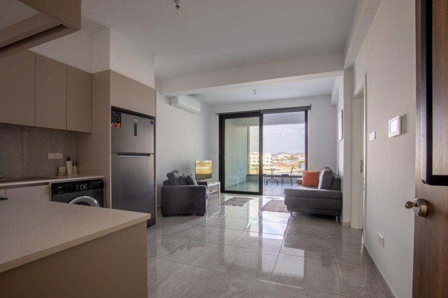 This bright and modern apartment offers a spacious bedroom with built-in wardrobes and direct access to a private balcony, creating a comfortable and relaxing living space. A large covered veranda overlooks the roundabout, making it ideal for enjoying morning coffee or working remotely. The fully equipped kitchen includes a fridge, oven, stovetop, and washing machine, while the contemporary living room features a sofa, armchair, smart TV, and dining area. The apartment also includes a stylish bathroom with a walk-in shower, air conditioning throughout, and large sliding glass doors that enhance the airy layout with plenty of natural light. A full furniture package is already included, allowing you to move in with just your suitcase. Additional benefits include private covered parking, a secure and well-maintained building, and a quiet community with modern finishes.