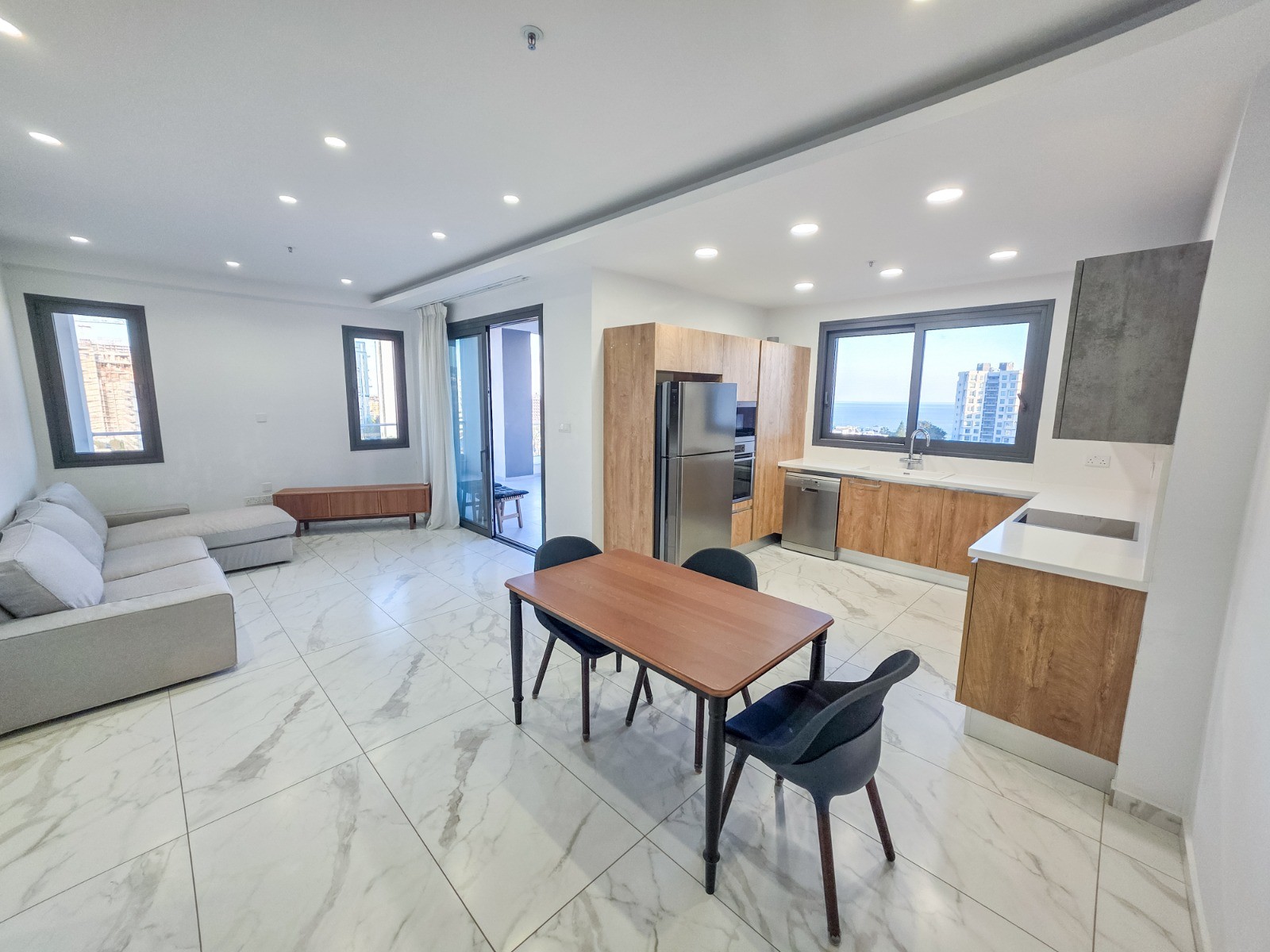 The apartment provides 106 sqm of internal space, complemented by a spacious 34 sqm veranda with open sea views. The layout includes a bright living area, three bedrooms and well arranged functional spaces suitable for everyday living.