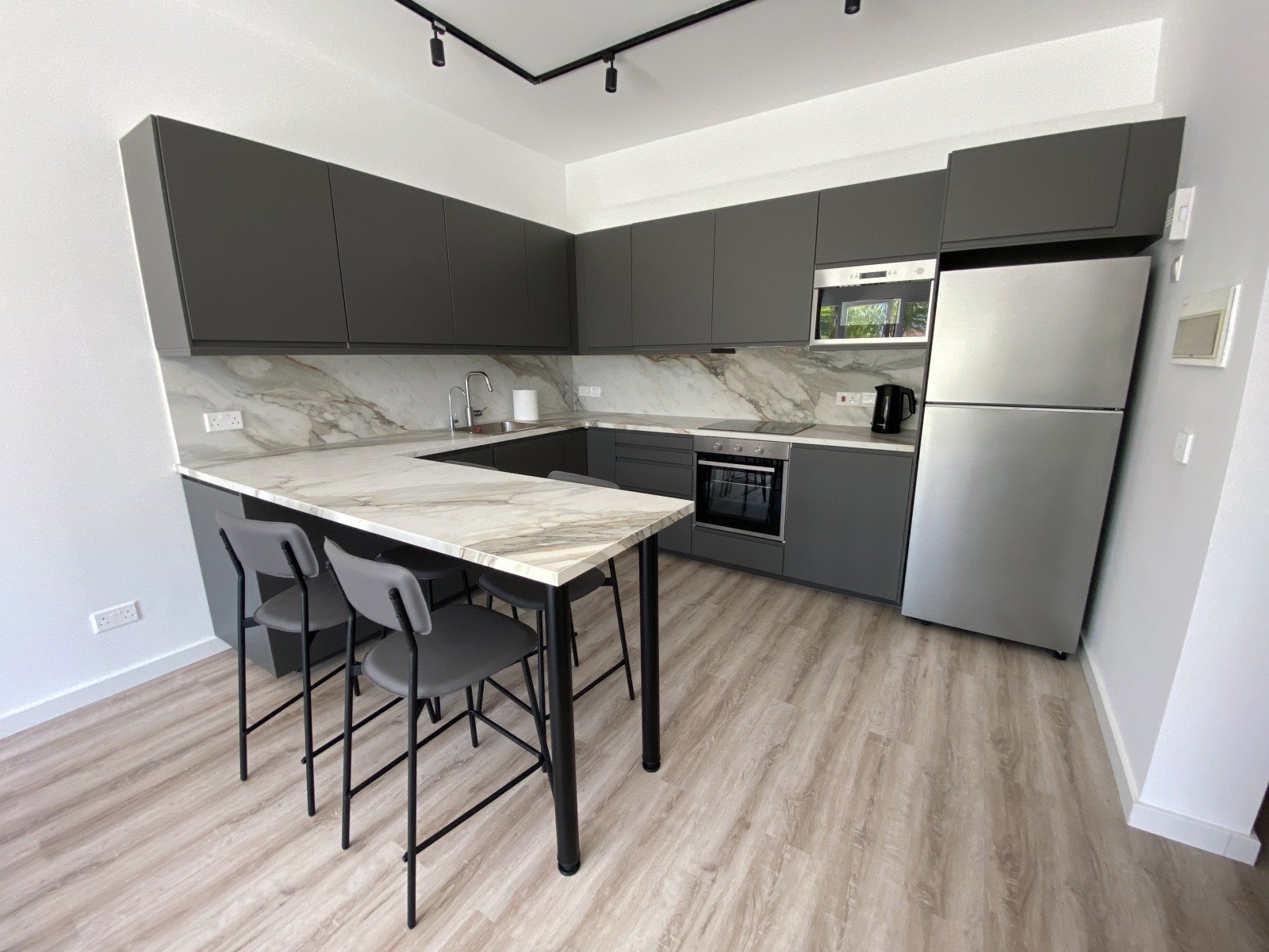 Полностью оборудованная кухня с гранитной столешницей и барной стойкой, оснащённая современной бытовой техникой