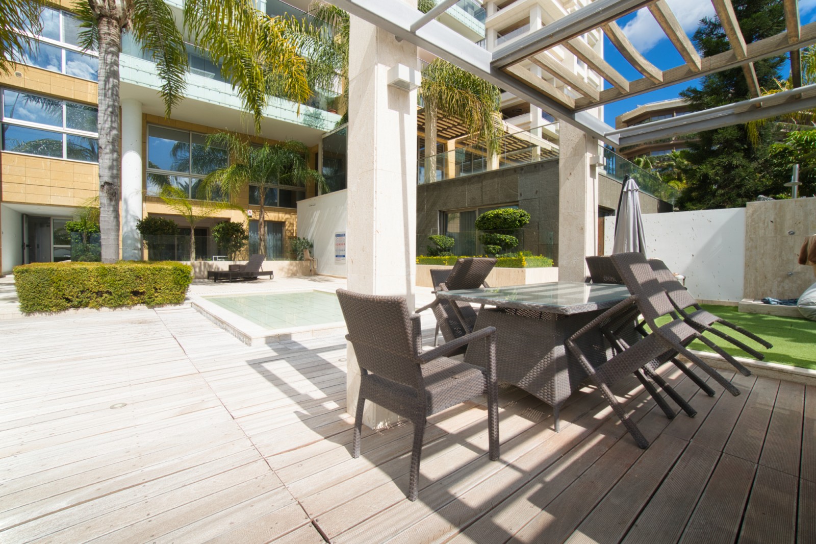 Квартира спроектирована с акцентом на комфорт и современный стиль жизни: каждая из трёх спален имеет собственную ванную комнату, что обеспечивает уединение и удобство, а отдельный гостевой санузел дополняет функциональность пространства. Полуоткрытая кухня соединяется со столовой и гостиной зоной, создавая гармоничную планировку, сочетающую простор и уют. Из гостиной можно выйти на просторную крытую веранду с видом на море и общий бассейн.
