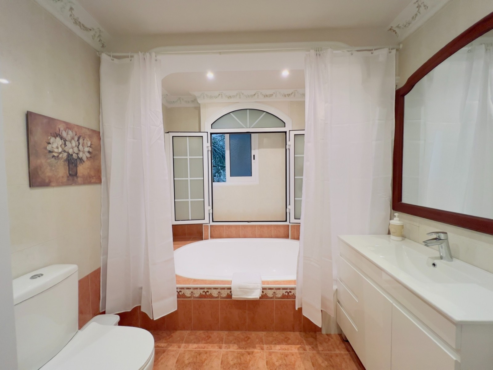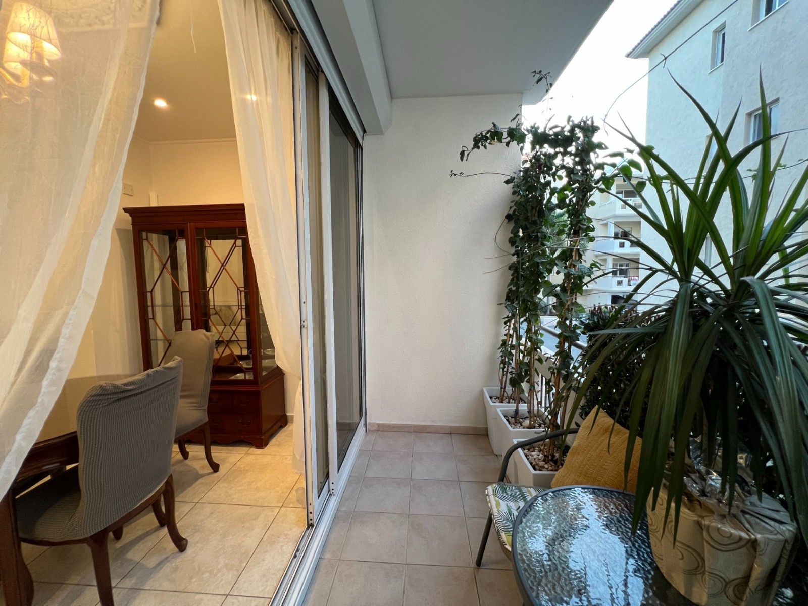 Квартира включает открытую планировку с полностью оборудованной кухней, гостиную, две спальни, одну ванную комнату и крытую веранду. Полностью меблирована и укомплектована: кондиционеры, окна с двойным остеклением, система повышения давления воды, солнечные панели для нагрева воды, ламинат в спальнях, тёплые полы в спальнях, кладовая и крытая парковка.