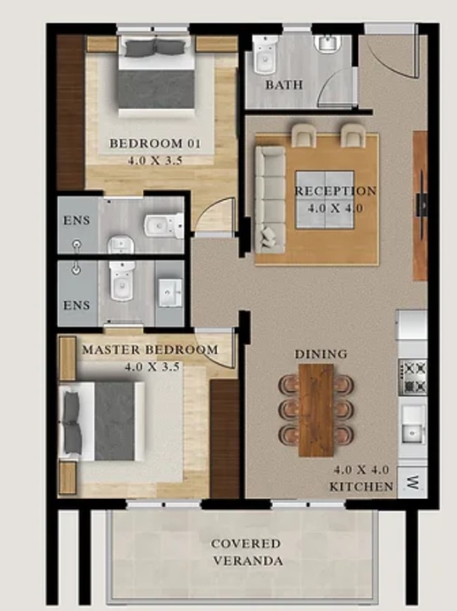 Предлагается широкий выбор квартир от 1 до 3 спален, включая апартаменты с садом и частным джакузи, а также двухуровневые пентхаусы с террасой на крыше.
