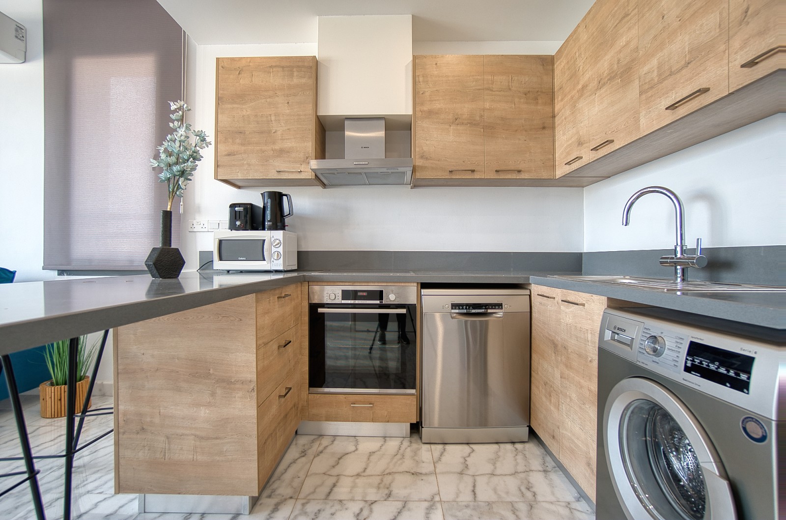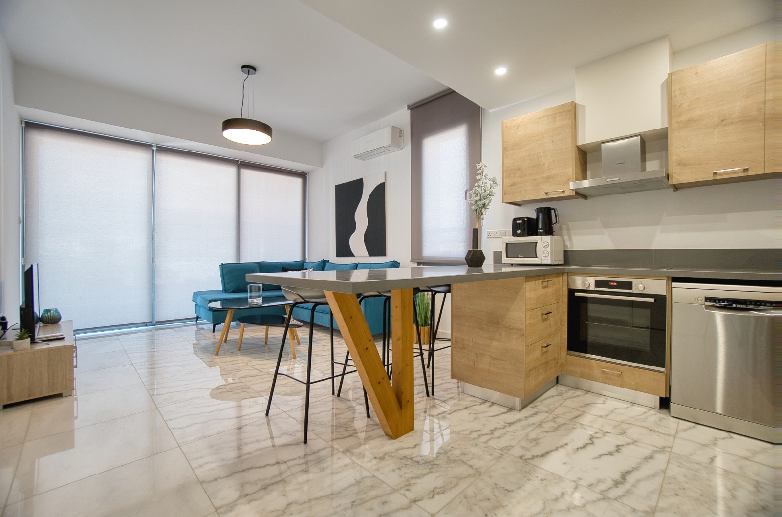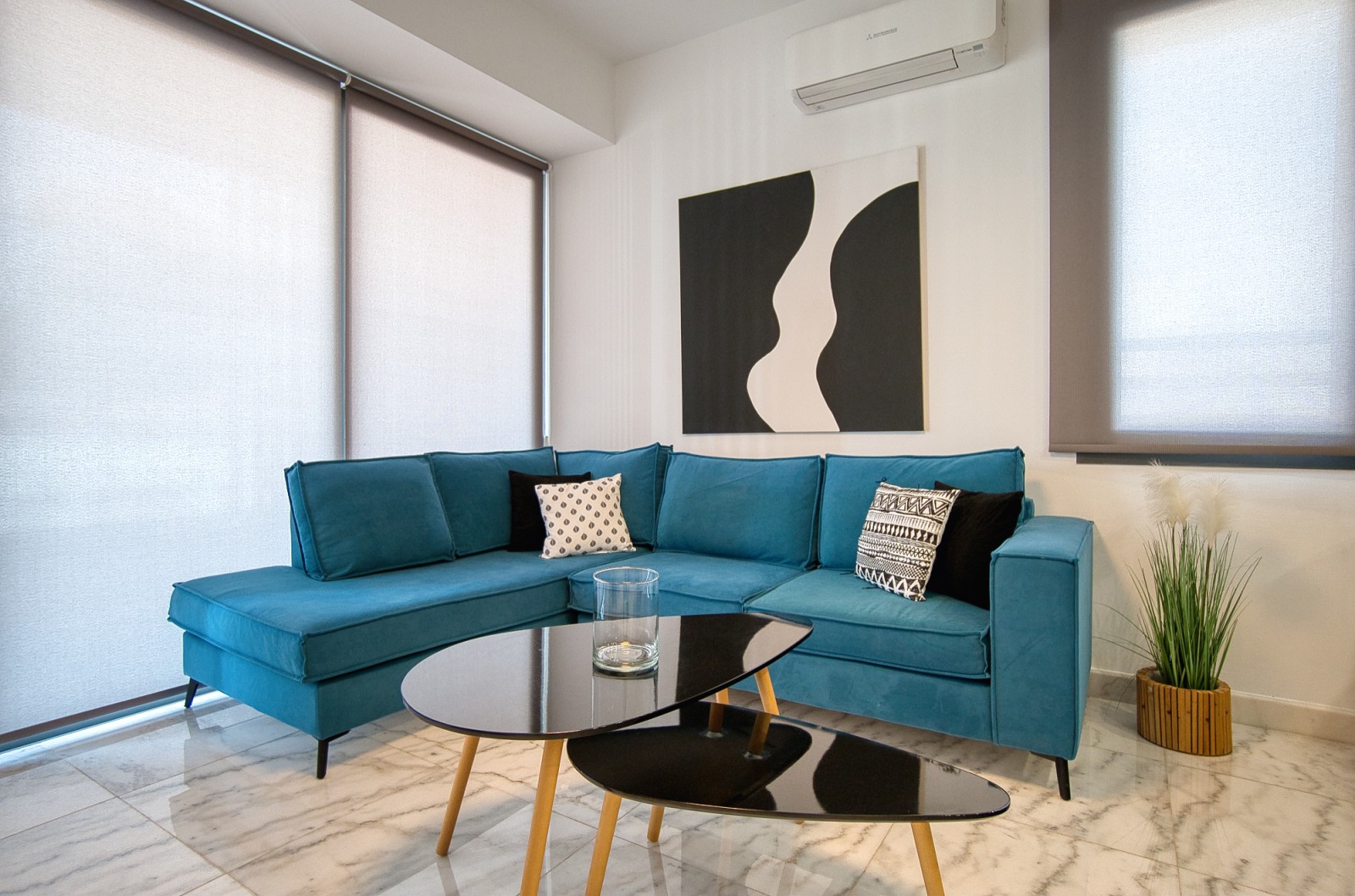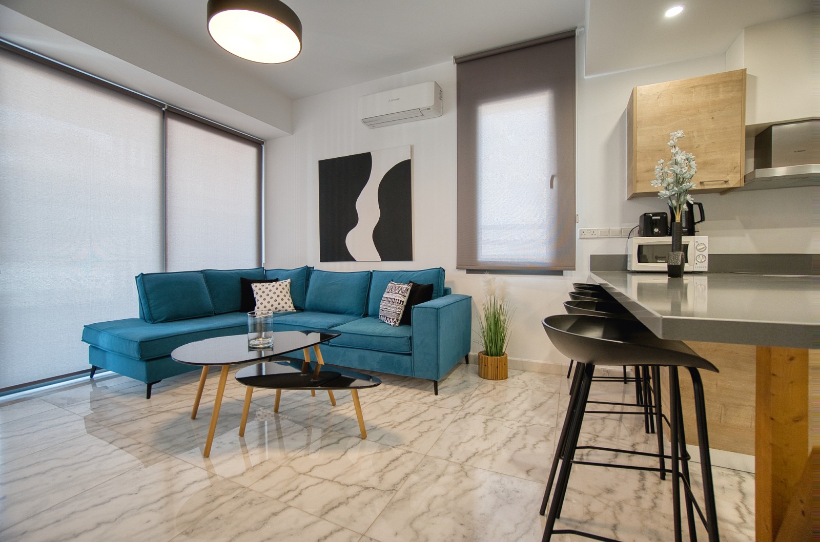 Fully furnished with modern design this 1 bedroom apartment is located in a quiet residential area and only a short walk from the picturesque fishing harbor , the beach, the ancient fort and busy restaurant district .Also it is conveniently close to the Old Town of Paphos, where you will find, among many other necessities, shops, supermarkets, museums, the library, post office and police station. For shoppers, the King’s Avenue Mall (Cyprus’ biggest shopping mall) is situated only a five-minutes walk away, whereas the sports nuts can enjoy bike rides and jogs along the nearby coastal path. Those lucky enough to have a car can also visit several other points of interest like golf courses, diving sites, wine routes and picturesque villages.