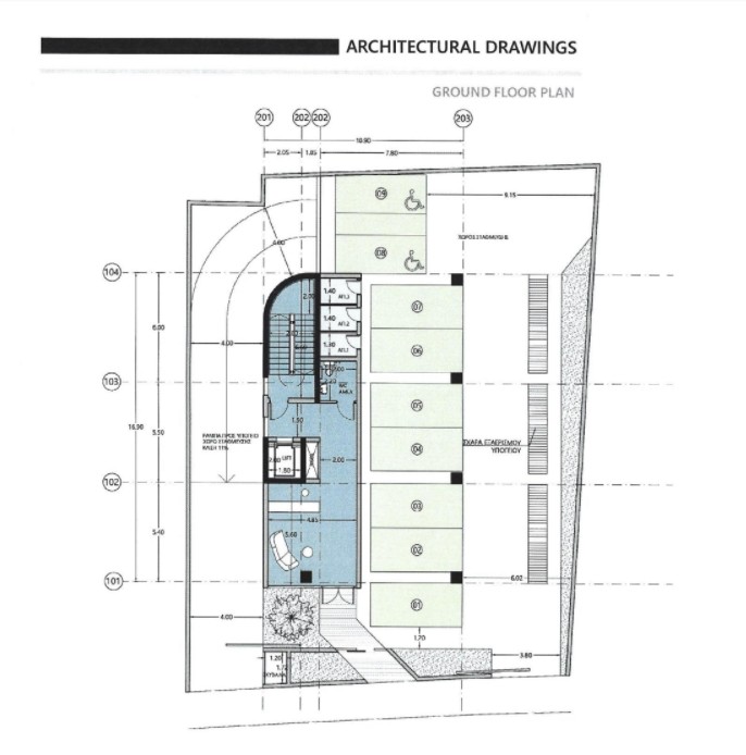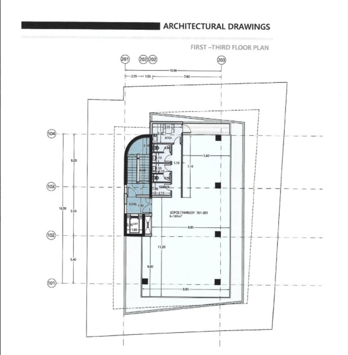 Он состоит из подвала (парковка), первого этажа с дополнительной крытой парковкой и вестибюля со стойкой регистрации, механического этажа и 3 этажей просторных офисов открытой планировки с закрытыми верандами.