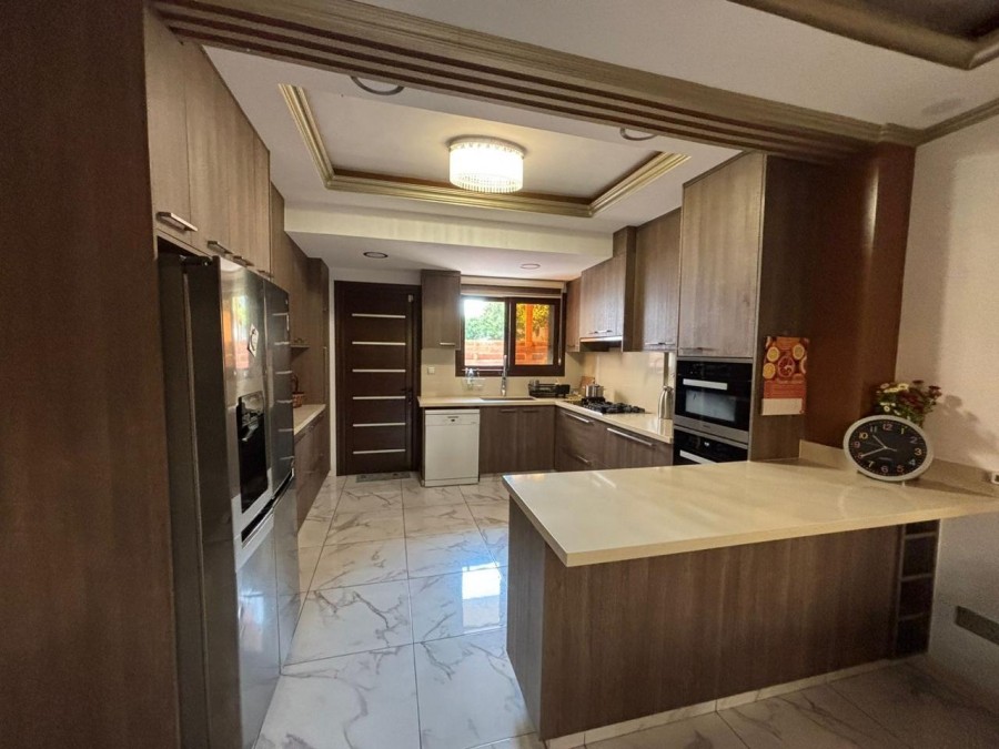 The main living area is large and comfortable, featuring a fireplace, wall mounted TV and marble style flooring, creating a warm and welcoming environment. The kitchen is fully equipped, and the house is offered fully furnished with everything required for immediate living.