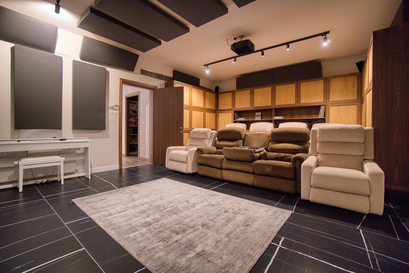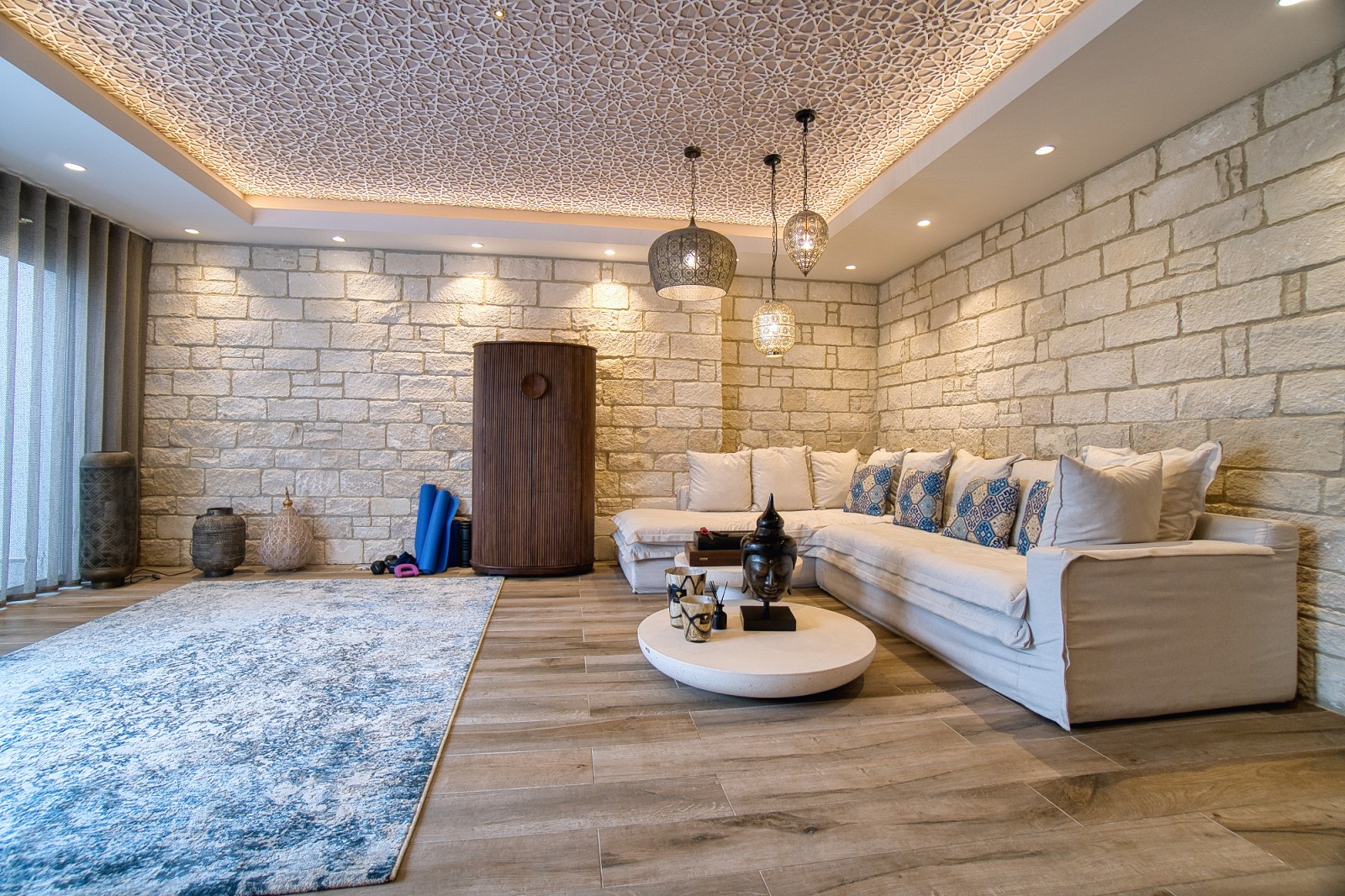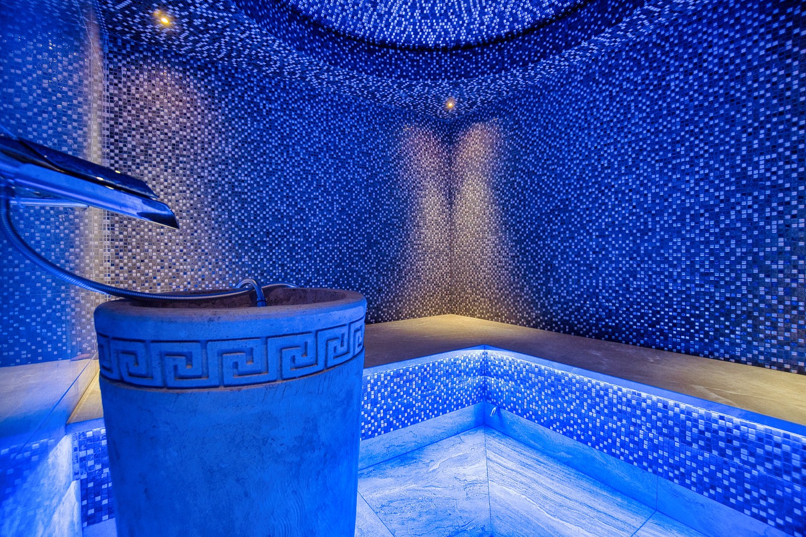 В подвале находятся просторное помещение, кинотеатр и хаммам, а также два складских помещения, туалет с душем и выход в отдельный двор с крытой зоной отдыха. Предусмотрена возможность установки джакузи, что добавляет нотку роскоши и утонченности.
