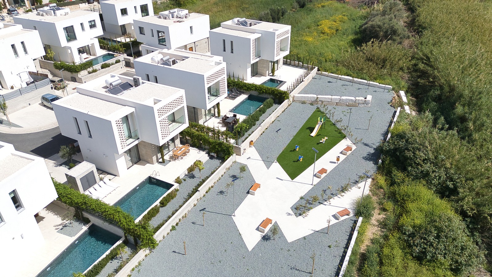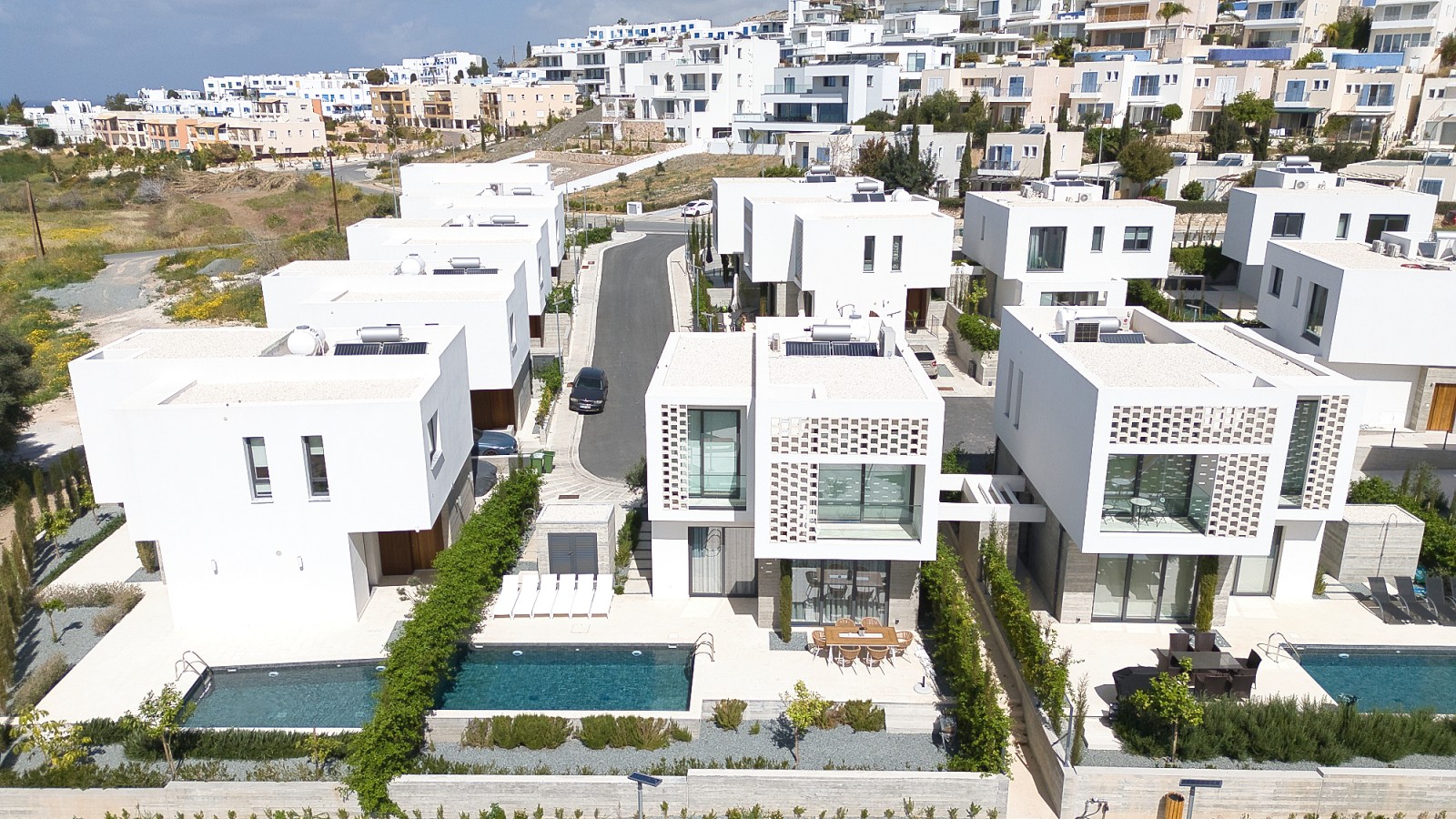 Этот уникальный комплекс, расположенный в деревне Холорака на окраине Пафоса, характеризуется привлекательной современной архитектурой с просторными и удобными зелеными зонами. Эти трехкомнатные виллы на продажу в Пафосе оригинально сочетают в себе использование белой отделки и светлого бетона, а декоративные стены также выполнены из бетонных блоков. Это место славится живописным видом на море, находится в нескольких минутах ходьбы от пляжа и поблизости от многих местных объектов инфраструктуры.