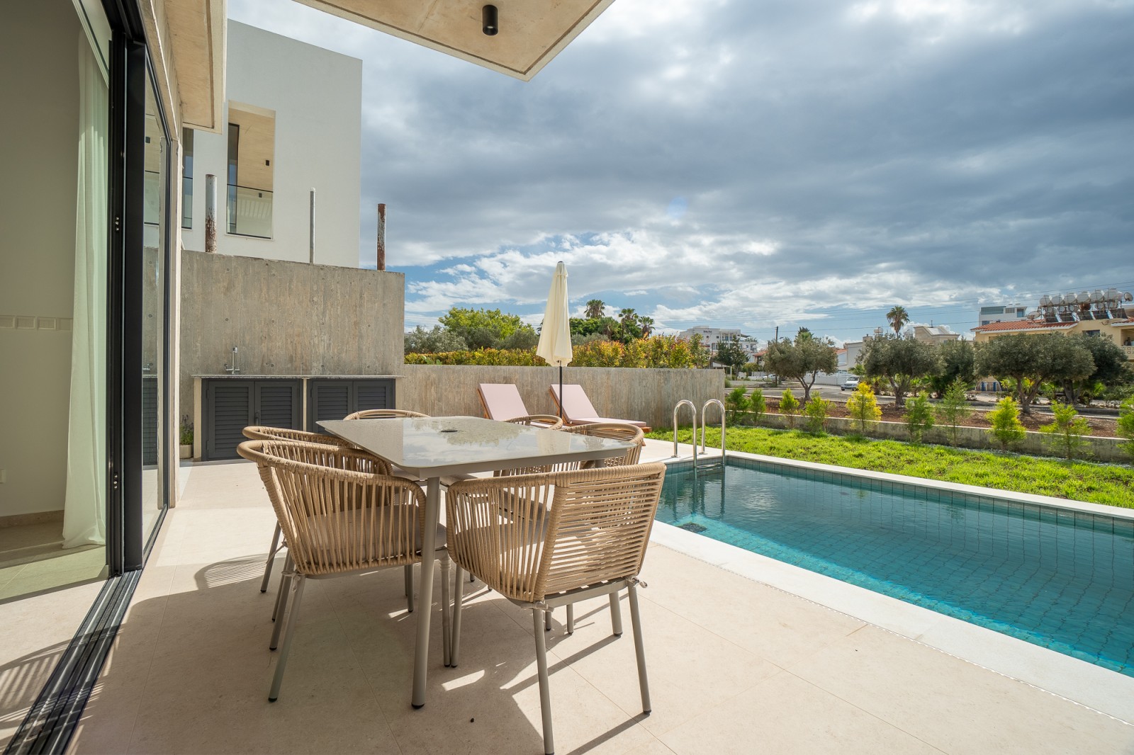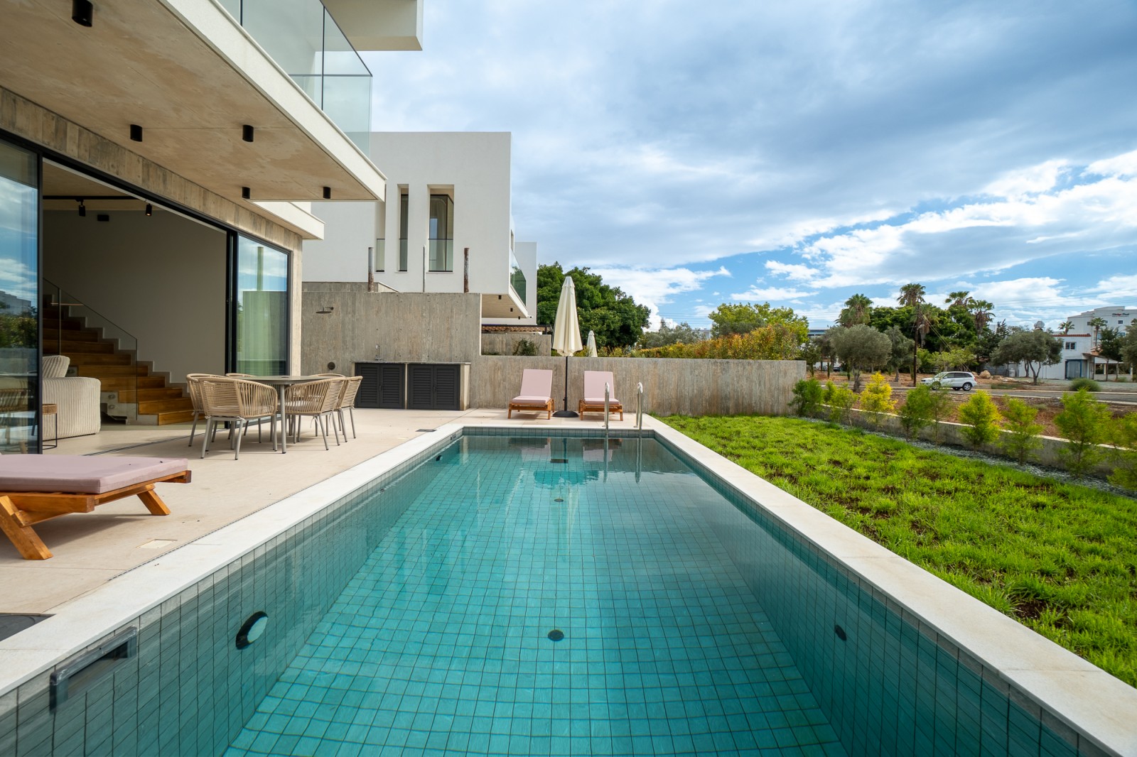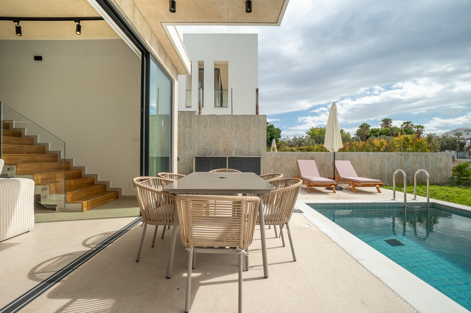 Снаружи вас ждут приватный бассейн, просторная солнечная терраса и встроенная зона для барбекю — идеальное место, чтобы наслаждаться солнечным климатом Кипра в полной приватности. Будь то отдых у бассейна, обед на свежем воздухе или приём гостей, каждая деталь продумана для лёгкой и комфортной средиземноморской жизни.