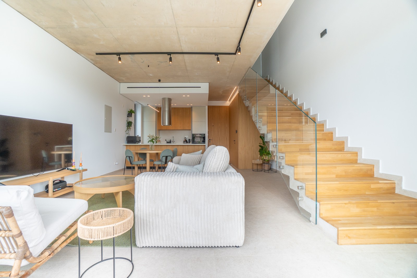 На основном этаже находится светлая открытая гостиная и полностью оборудованная кухня — идеальное пространство как для приёма гостей, так и для повседневной семейной жизни. На верхнем этаже обе спальни открываются на потрясающий вид на море, создавая спокойное убежище, где горизонт становится частью вашего ежедневного опыта.