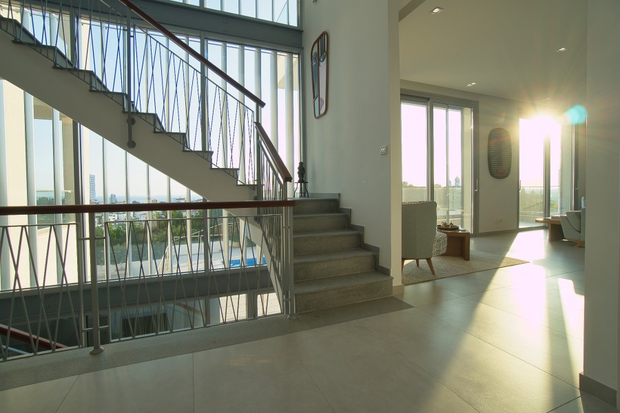 На первом этаже расположена просторная кухня с обеденной зоной, плавно переходящей в крытую террасу с великолепным видом на побережье Лимассола и сверкающее море. Просторная гостиная идеально подходит как для отдыха, так и для приёма гостей. Панорамные стеклянные двери ведут на ещё одну крытую террасу с чарующими видами на море и зону бассейна, создавая атмосферу уединённой роскоши.