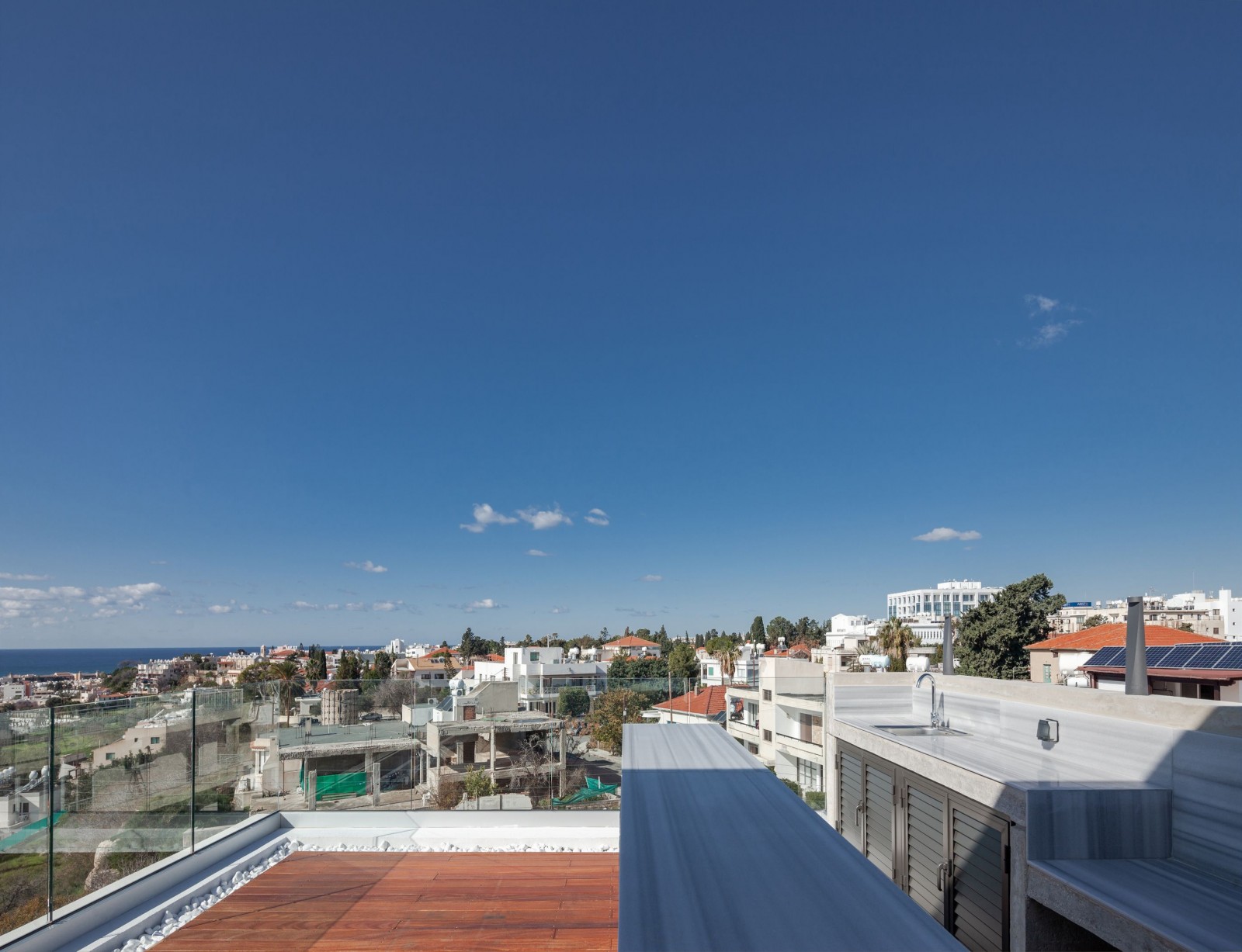 Вилла — это великолепный пример роскоши и удобства в самом сердце Пафоса. Использование высококачественных материалов, таких как камень, архитектурный бетон и дерево, гарантирует долговечность и эстетическую привлекательность. Вилла разделена на три уровня и включает 4 спальни, 4 ванные комнаты и частный лифт для дополнительного комфорта. Главной изюминкой является сад на крыше с бассейном и зоной для барбекю — идеальное место для приема гостей или отдыха с захватывающими видами.