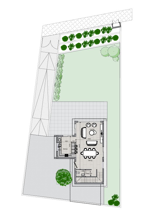Дом построен на двух уровнях и имеет функциональную и хорошо продуманную планировку. На первом этаже расположены просторная гостиная с обеденной зоной, кухня открытого плана с центральным островом и гостевой санузел. Большие панорамные проёмы соединяют гостиную с просторной крытой верандой, создавая плавный переход между внутренним пространством и садом.