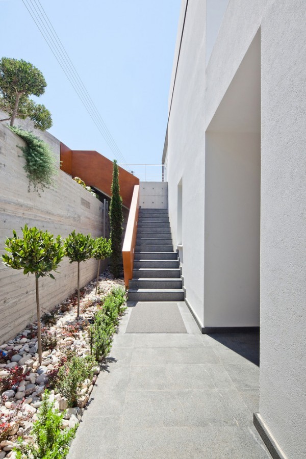 Это трёхэтажный дом с четырьмя спальнями, расположенный на склоне холма в районе деревни Тала, Пафос, с входом на верхнем уровне и потрясающими панорамными видами на юг и море. Въезд для автомобилей осуществляется с уровня дороги, где находится крытая, но открытая парковка с вертикальными деревянными ламелями для затенения и безопасности. Архитектура дома разработана с учётом рельефа: каждый уровень размещён ниже предыдущего, обеспечивая максимальную приватность и идеальное использование естественного уклона. Жилые помещения — кухня, столовая и гостиная — находятся на среднем уровне и выходят к бассейну и террасе, эффектно консольно нависающим над обрывом. Подсобные помещения и санузлы размещены в глубине планировки на каждом уровне. С улицы дом выглядит как одноэтажный, однако с нижней стороны открывается драматичный вид на «парящие» объёмы из натурального бетона. Здание частично заглублено в склон, что обеспечивает естественную теплоизоляцию: прохладу летом и тепло зимой. Большие окна, ориентированные на юг, наполняют дом светом и видом, а навесы и ламели регулируют солнечные потоки. Конструкция и ограждающие элементы выполнены с высокими теплоизоляционными характеристиками, а все инженерные системы и оборудование — энергоэффективные. Имеются правоустанавливающие документы (Title Deeds). Тала, находящаяся всего в 8 км от Пафоса, славится своими видами, монастырём Аг. Неофитос и популярностью среди экспатов благодаря удобному расположению и доступности всех районов города.