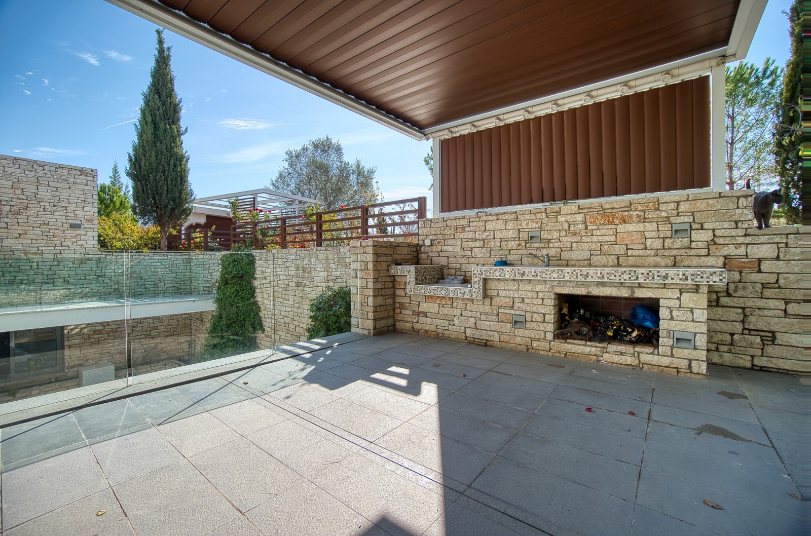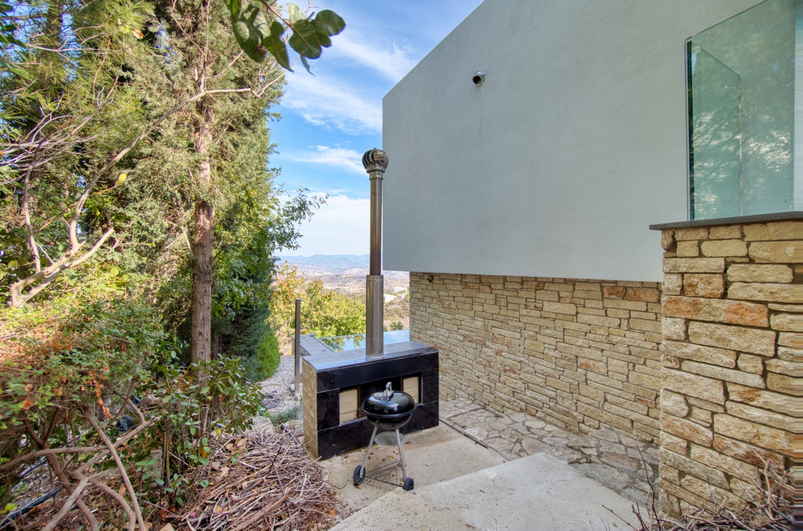 Внешнее пространство виллы не менее впечатляюще — частный бассейн с видом на живописные пейзажи. В собственности имеются крытая и открытая парковка, фотогальваническая система для энергоэффективности, а также охраняемый жилой комплекс с полноценной системой сигнализации.