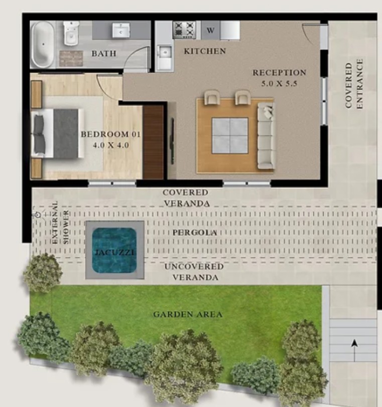 Данный блок имеет садовую зону площадью 28 квадратных метров.