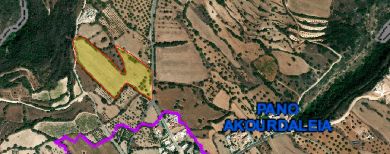 Участок расположен в деревне Пано Акурдалия с легким доступом к центру деревни и удобствам. Зоны планирования участка - H2 (87%) с плотностью застройки 90% и коэффициентом покрытия 50% и H3 (13%) с плотностью застройки 60% и коэффициентом покрытия 35%. Разрешено строительство до 2 этажей и максимальная высота здания 8,3 метра. Площадь участка - 19 693 кв.м. Имеются титулы собственности.