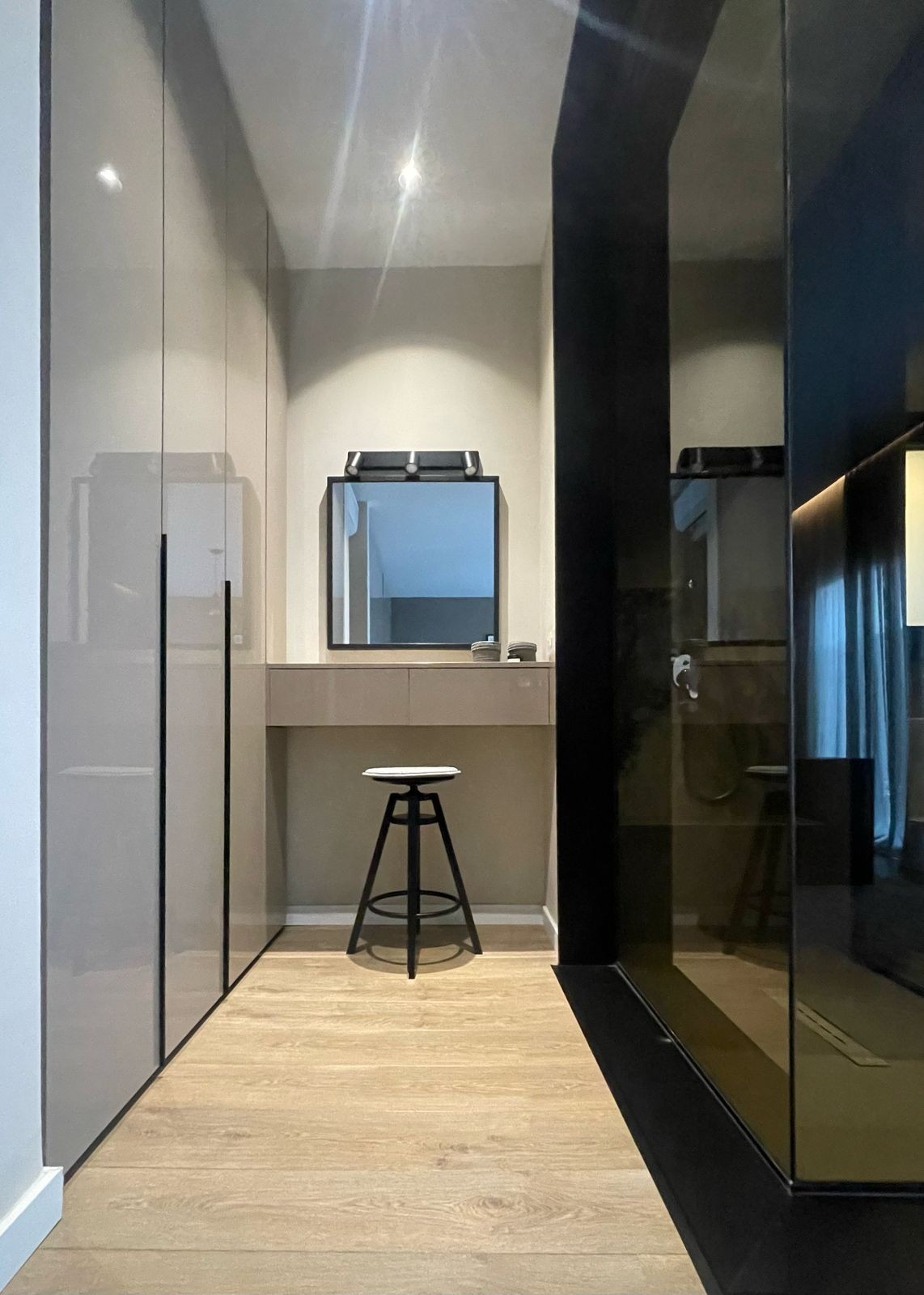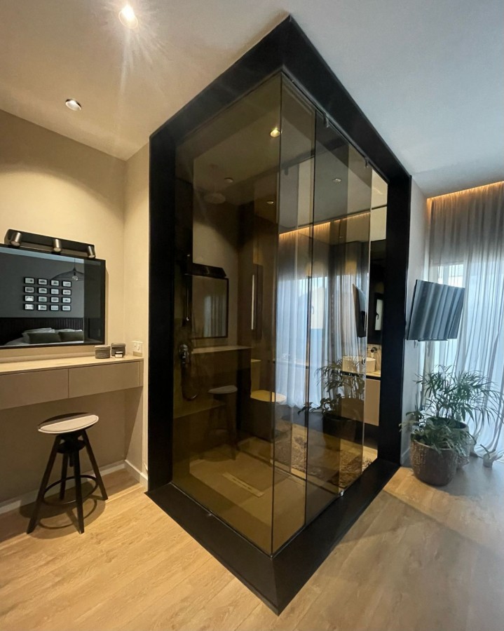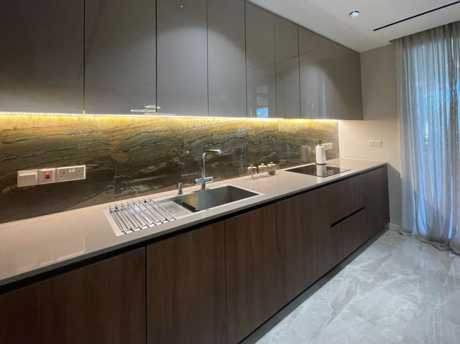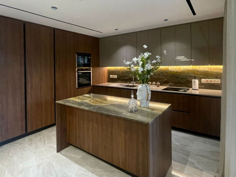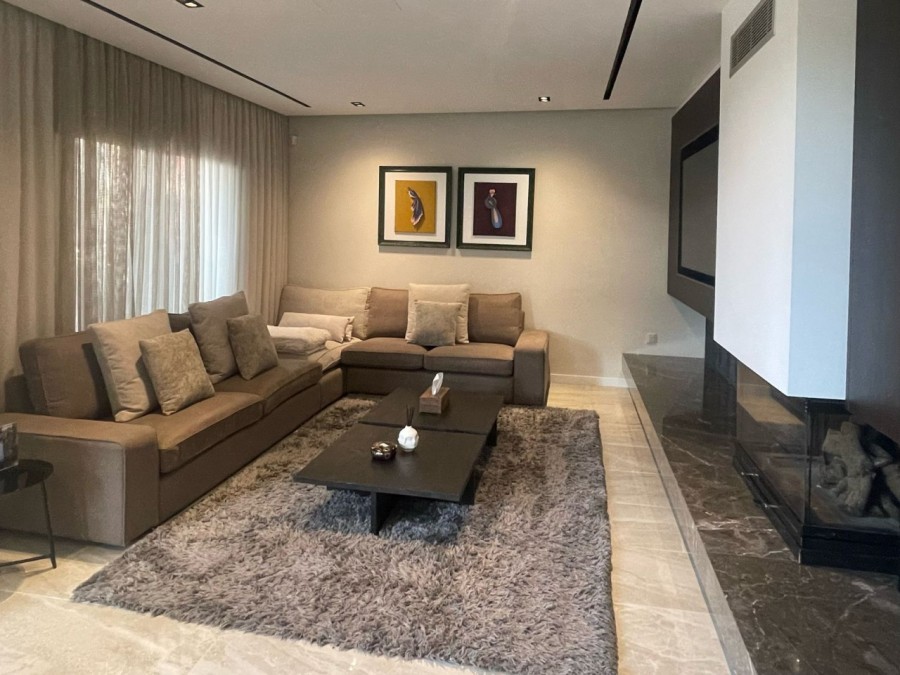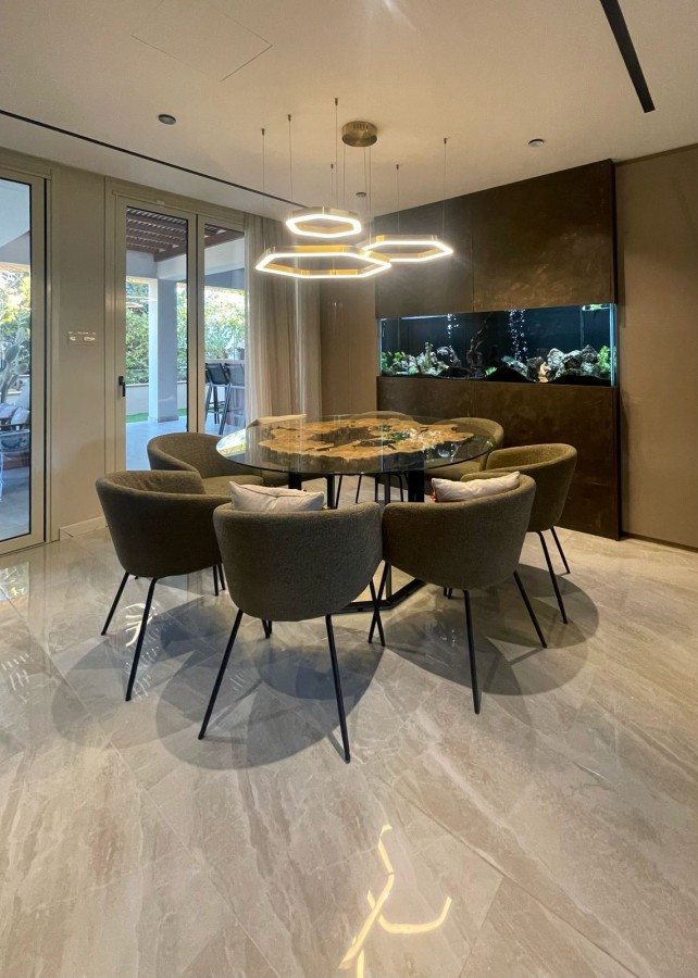 The open-plan design creates a spacious and inviting atmosphere, with concealed A/C throughout the living, dining, and kitchen areas. The integrated kitchen is fully equipped with high-end appliances, and a built-in aquarium adds a unique touch of elegance. A built-in fireplace in the living area enhances the cozy ambiance, while the water filter system ensures pure water throughout the home.
