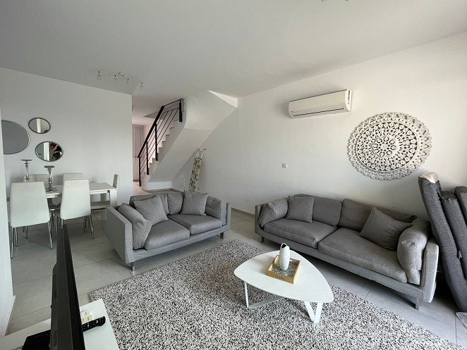 Этот полудом с просторной гостиной и столовой открытой планировки, а также отдельной большой оборудованной кухней. Гостиная ведёт на полуоткрытую веранду с выходом и видом на общий бассейн. Гостевой туалет расположен на уровне продажи. На втором этаже находятся 3 большие спальни, главная спальня с ванной комнатой и одна общая ванная комната. Доступна крытая частная парковка.